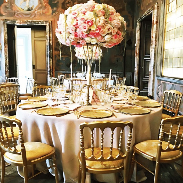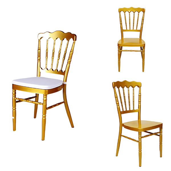This Napoleon Gold Chair is perfect for Weddings, Birthday Parties, Gala Events, Corporate Events, and Private Events. A stunning blend of elegance and modern design. Crafted from high-quality acrylic material, this chair boasts a sleek and transparent appearance that adds a touch of sophistication to any event or venue.