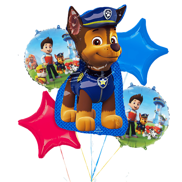5 pcs Paw Patrol Chase Balloon Bouquet Includes: 1 pc Chase shape foil balloon, 2 pcs Printed Round Foil Balloon 18 inches 1 pc red star shape foil balloon 18 inches 1 pc Blue star shape foil balloon 18 inches 1 pc weight Helium filled Use alone or mix and match with different balloon sizes and latex balloon to create your own balloon bouquet or balloon arch. Note: Floating time varies based on altitude, humidity, and temperature.