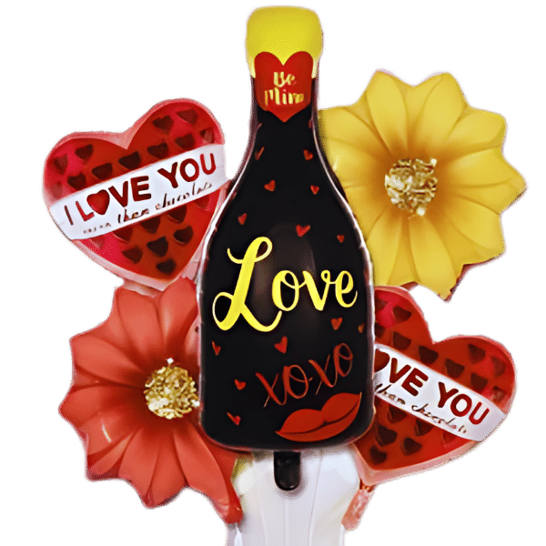 5 pcs Love Valentines Theme Balloon bouquet Includes: 1pc Bottle Champagne Foil balloon 32 inches 2 pcs Red Heart Foil Balloon 17 inches 2 pcs Flower Shape Foil Balloon 20 inches 1 pc Weight Helium filled